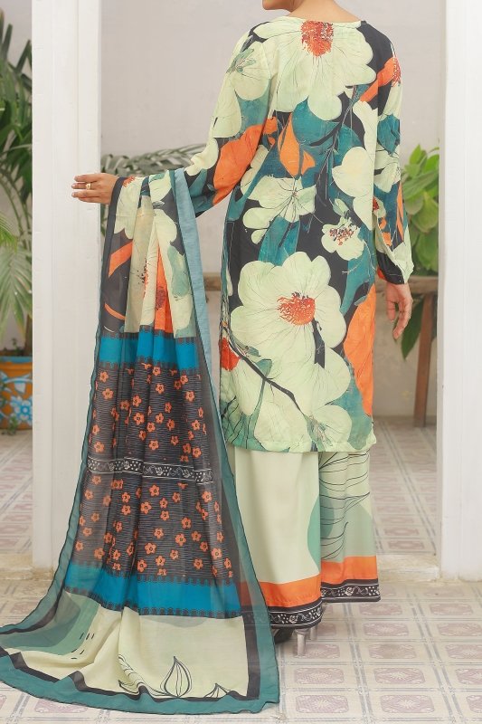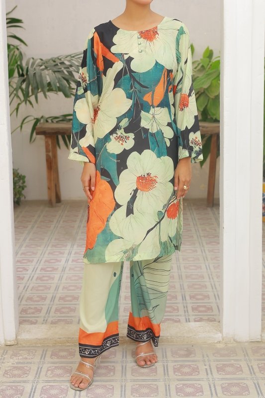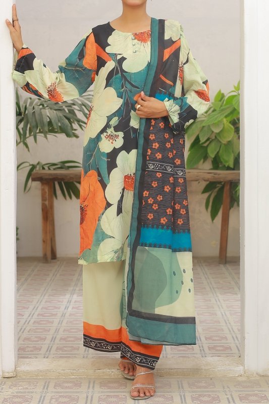 Shirt: Swiss Lawn – breathable, soft, and adorned with large tropical floral prints for a bold, refreshing style.