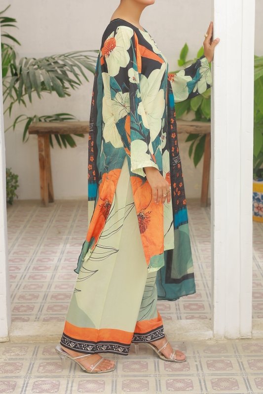 Make a bold statement with Tropical Bloom, a vibrant 3‑piece ensemble featuring oversized floral prints in shades of ivory, orange, teal, and black. The straight-cut shirt showcases striking tropical blooms for a refreshing and lively look, paired with wide-leg trousers in soft ivory with contrasting orange and black borders. A flowing dupatta in Swiss Voile ties the look together with a playful mix of floral and geometric elements, adding a modern touch to traditional charm.