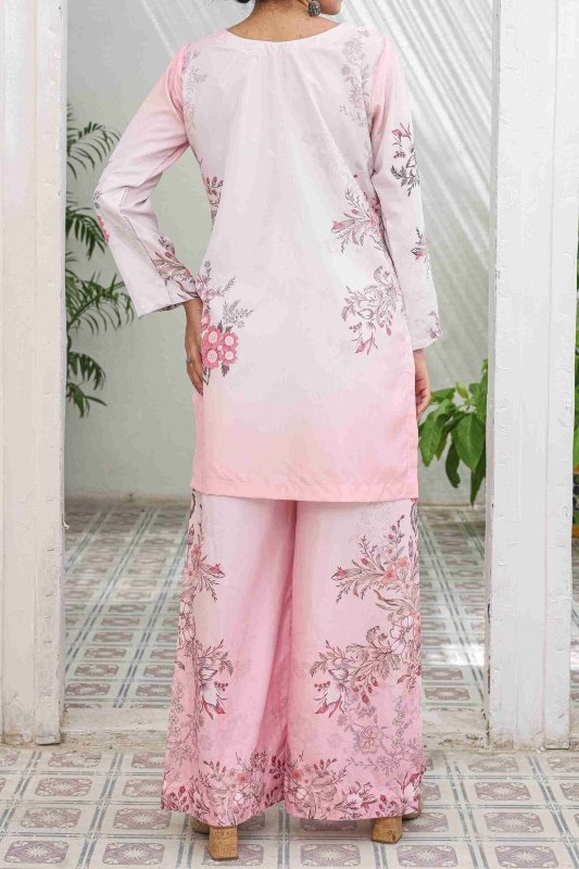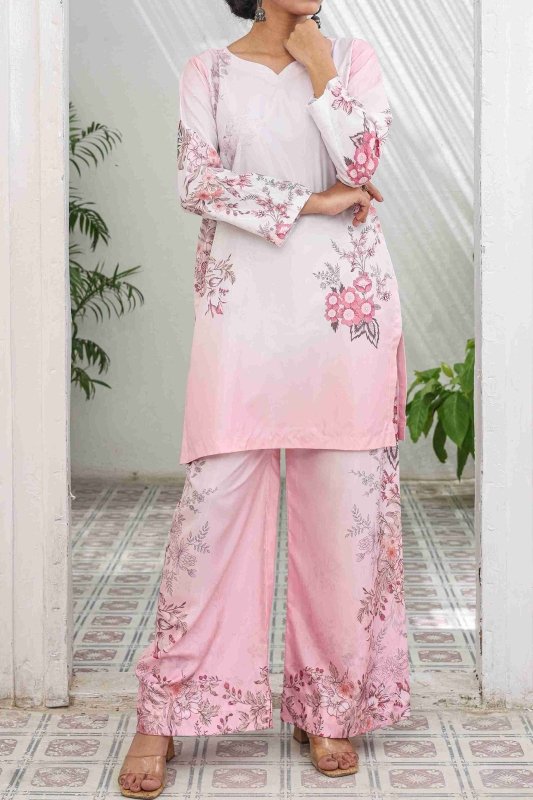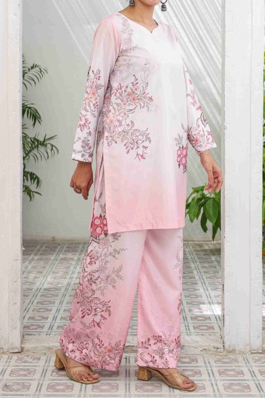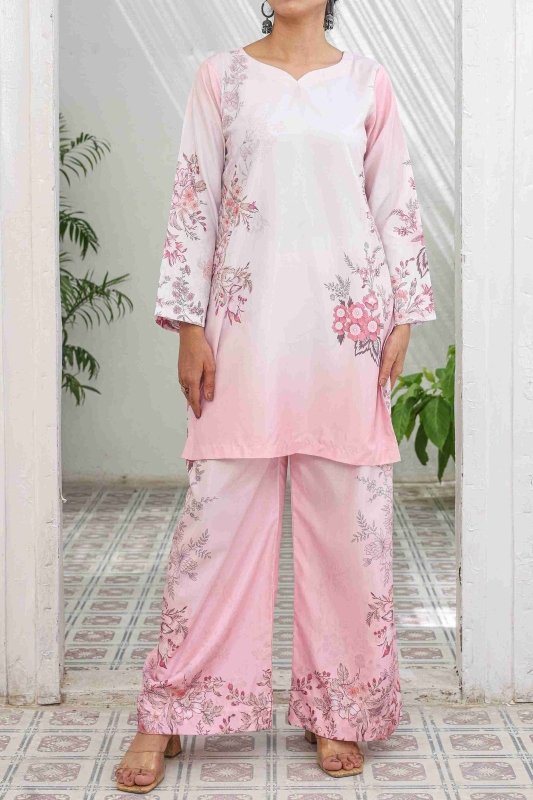 Step into elegance with our Rosé Blossom Co-Ord Set, a dreamy blend of soft blush pink tones and delicate floral artistry. Crafted in premium Russian Silk, this ensemble brings both comfort and sophistication to your wardrobe.