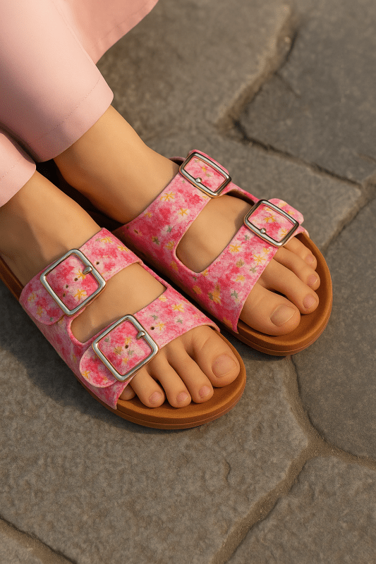 Step into a bloom of bold elegance with our Slides — a perfect fusion of comfort and statement style. Featuring a striking floral print over a deep black base, these double-strap slides come with polished gold buckles and a soft cushioned insole for all-day wear. Whether you’re heading out for errands or dressing down for a chic summer look, these slip-ons add a vibrant, trendy touch to your outfit.