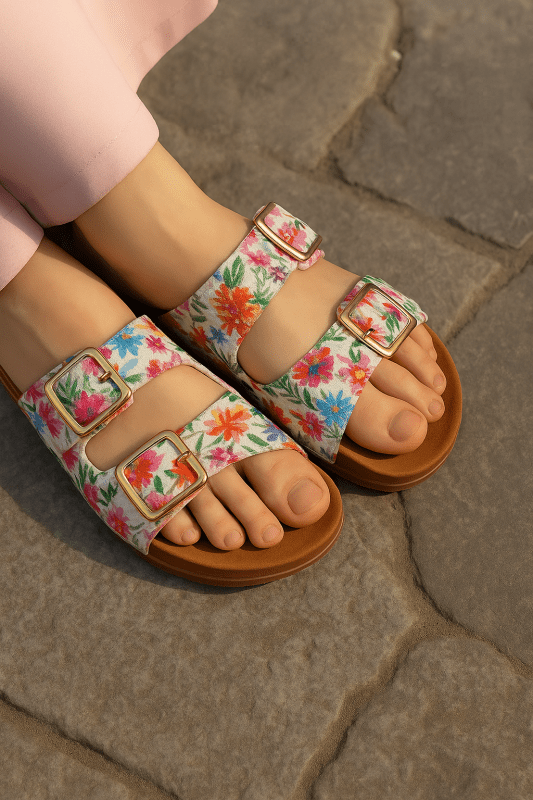 Step into a bloom of bold elegance with our Slides — a perfect fusion of comfort and statement style. Featuring a striking floral print over a deep black base, these double-strap slides come with polished gold buckles and a soft cushioned insole for all-day wear. Whether you’re heading out for errands or dressing down for a chic summer look, these slip-ons add a vibrant, trendy touch to your outfit.