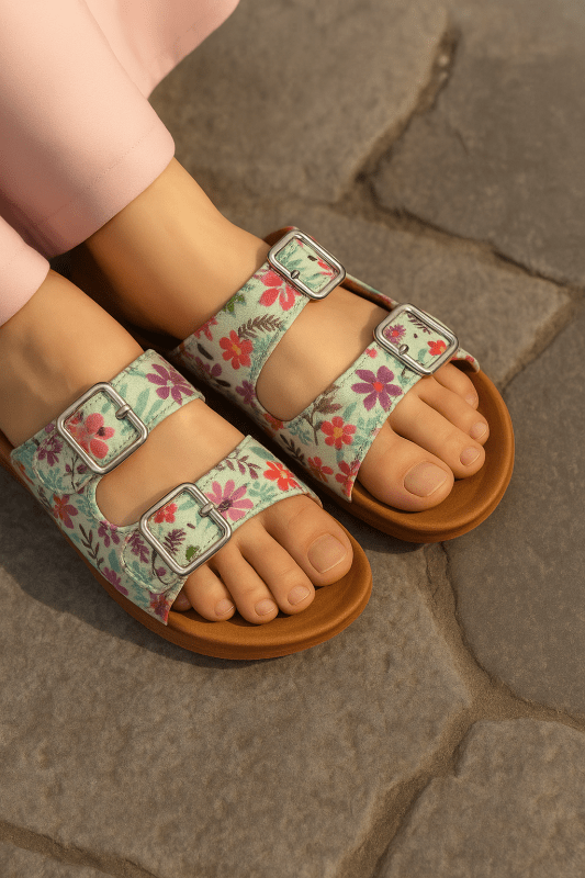 Step into a bloom of bold elegance with our Slides — a perfect fusion of comfort and statement style. Featuring a striking floral print over a deep black base, these double-strap slides come with polished gold buckles and a soft cushioned insole for all-day wear. Whether you’re heading out for errands or dressing down for a chic summer look, these slip-ons add a vibrant, trendy touch to your outfit.