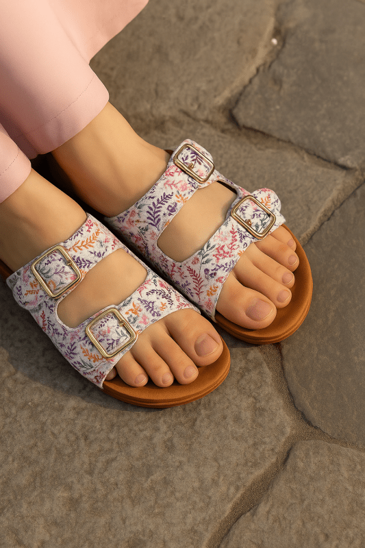 Step into effortless comfort and floral charm with our Floral Breeze Twin-Buckle Slides. Featuring a white base adorned with delicate multicolor leaf and flower motifs, these chappals are designed to add a playful yet elegant touch to your casual wardrobe. The dual buckle straps provide adjustable support, while the cushioned footbed ensures all-day comfort. Perfect for daily wear, beach strolls, or relaxed outings, these printed slides pair beautifully with jeans, shalwars, or summer dresses.