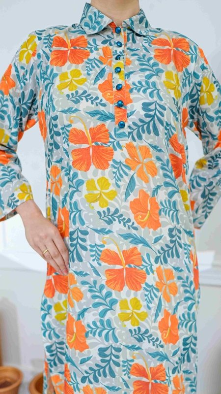 This stitched set features a lively floral print in cheerful shades of orange, yellow, and teal on a calming light grey base. With its versatile fabric width, you can tailor this ensemble to your perfect fit and style, whether it's a straight-cut kurta or a flowy design.