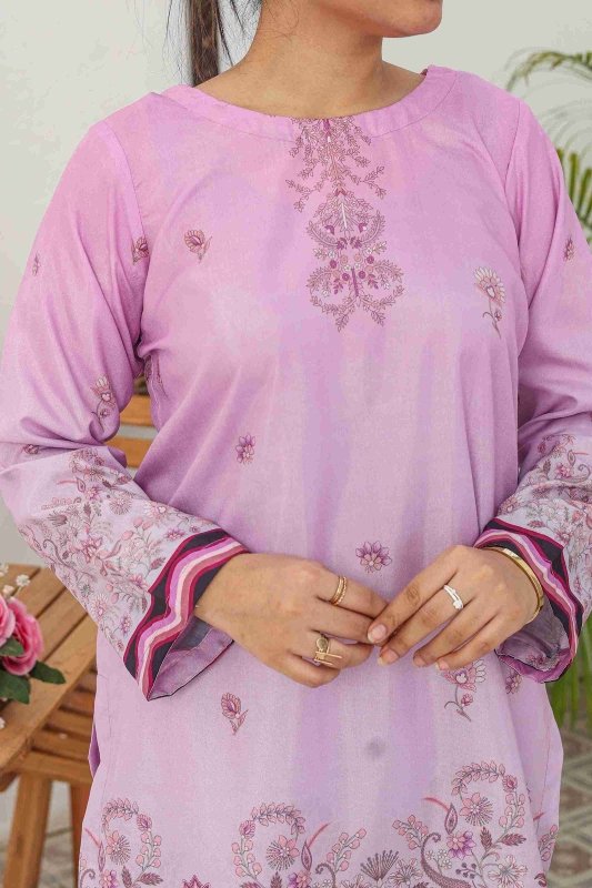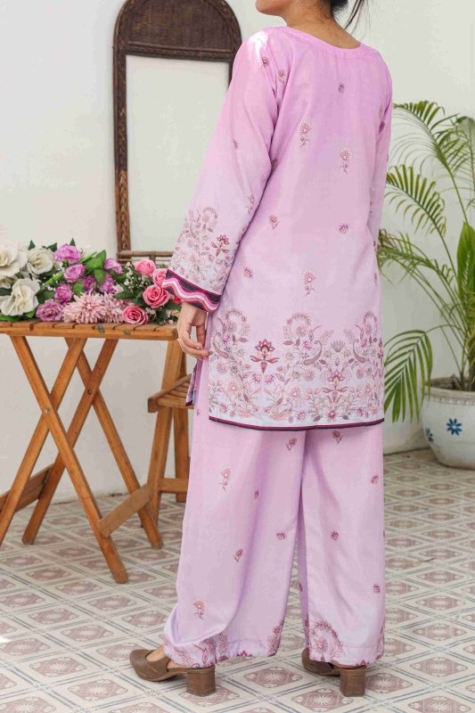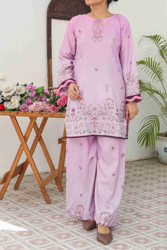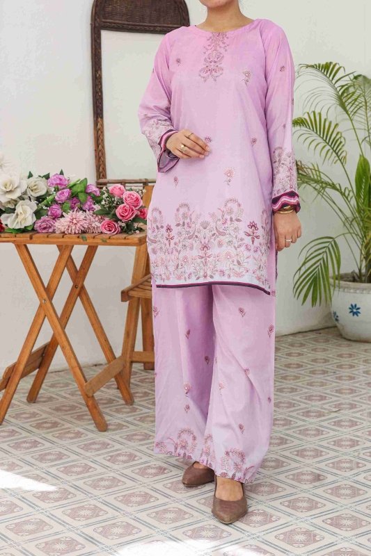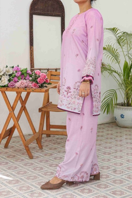 Radiate elegance with Violet Whisper, a soft lilac co-ord set crafted from premium Russian silk. The shirt features delicate floral patterns in subtle embroidery-inspired prints, paired with wide-leg trousers for a graceful and relaxed silhouette. The breathable fabric ensures comfort while maintaining a polished look, making it ideal for casual outings or semi-formal gatherings.