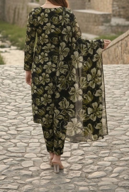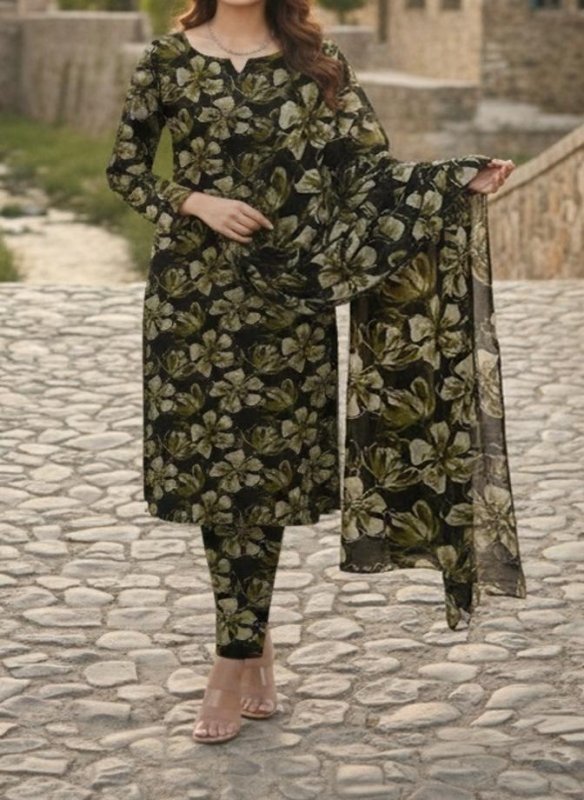 The deep black base is enriched with olive and moss-toned floral prints, creating a sophisticated, nature-inspired look. Featuring a straight, comfortable silhouette with a matching printed dupatta and trouser, this suit ensures both ease of wear and refined winter styling.